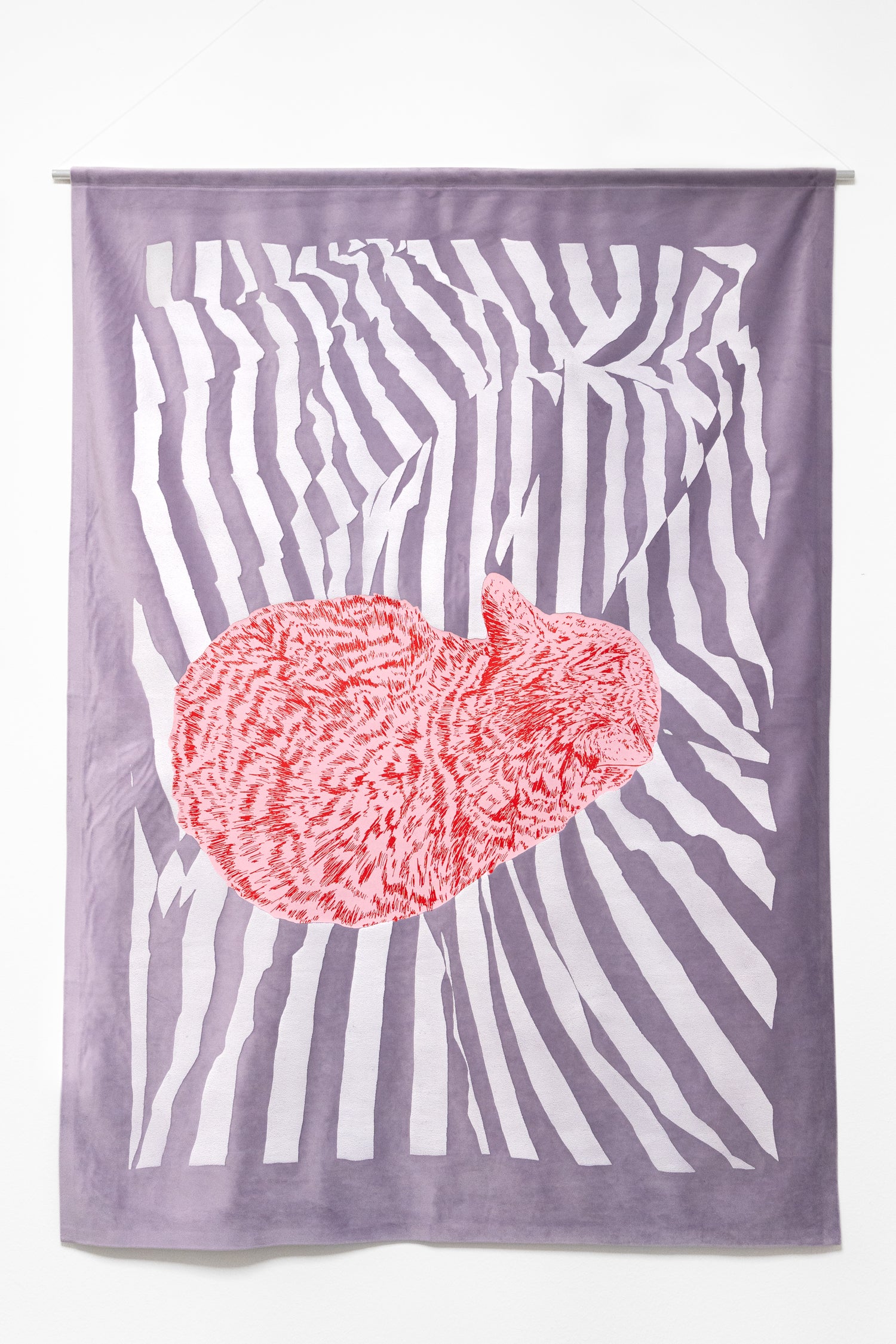 Für die Edition Dreamer entstand ein außergewöhnlicher dreifarbiger Siebdruck auf Samt – ein Material, das durch seine besondere Oberfläche und Haptik den Charakter der Arbeit prägt. Mit dem Einsatz von Pufffarbe und fein abgestimmten Farbebenen entsteht eine reliefartige Struktur, die die Stofflichkeit des Materials betont. Die Arbeit wurde als Fahne zum Aufhängen konzipiert und entfaltet durch Licht und Bewegung eine eigene Lebendigkeit. Inmitten der vielschichtigen Textur erscheint die Katze als einzig glatte Fläche – ein ruhender Pol, der die Komposition ausbalanciert.